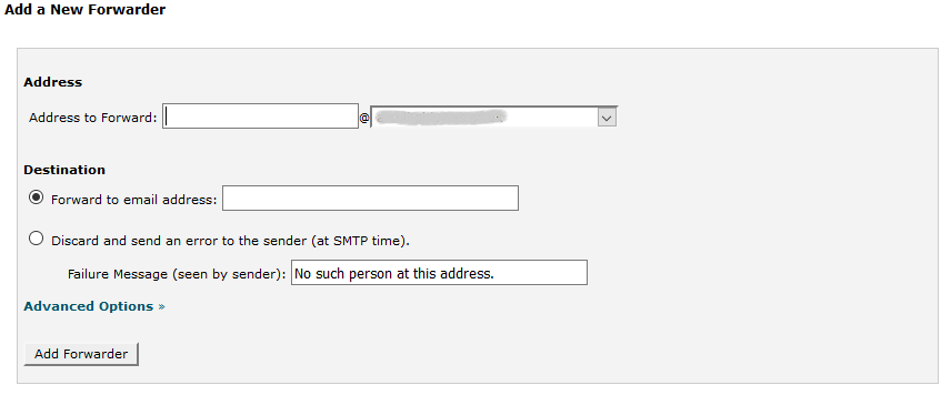 In the "Address to Forward" box enter the address that you just created and in the "Destination" box, enter in
